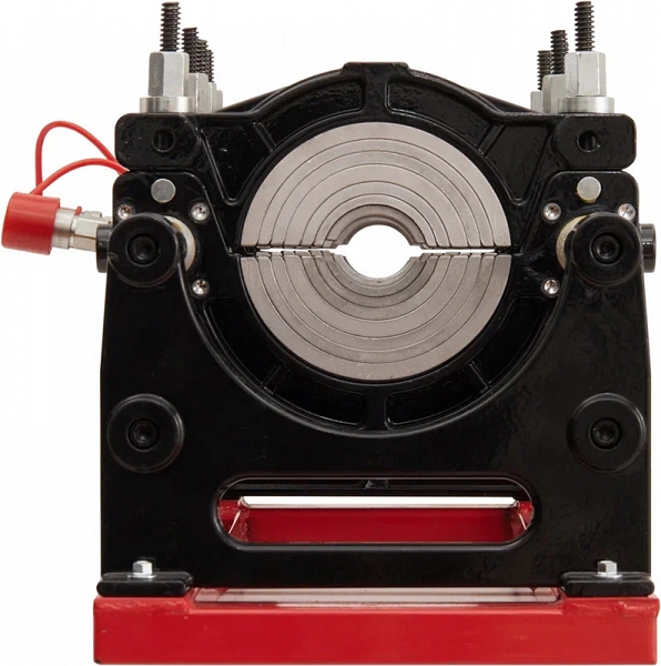 - Центраторо с гидравлическим приводом и 4-мя прочными широкими зажимами, один из которых легко может быть удален для облегчения сварки полимерных фитингов с трубами (тройники, крестовины, отводы), имеет большой запас прочности за счет качественного сплава и ребер жесткости, что позволяет сваривать полимерные трубы с любым показателем SDR