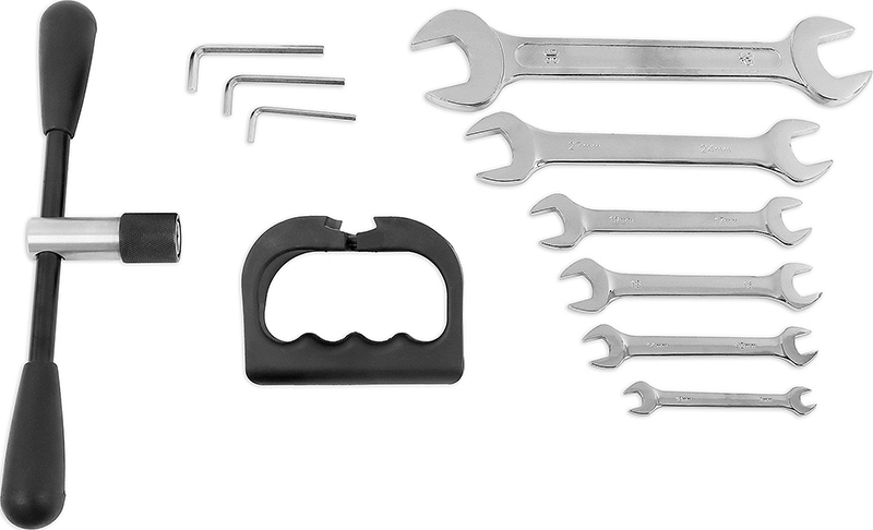 - Комплектуется 4-мя крепежными болтами, 6-тью рожковыми ключами, 3-мя угловыми шестигранными ключами, распорным болтом-головкой, 4-мя юстировочными болтами, рукояткой-штурвалом, дополнительным упором, 2-мя транспортировочными рукоятками, переходной плитой, 2-мя транспортировочными колесами